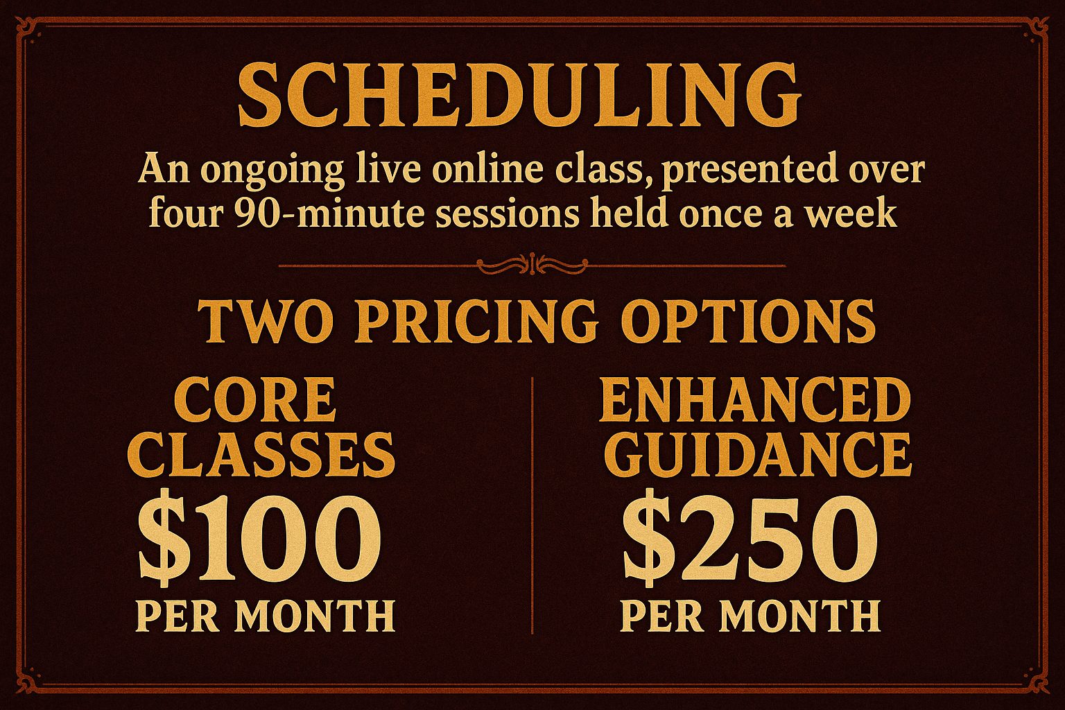 • Four 90-minute live, online classes per month covering and guiding you on building outlines, creating logical narrative movement and prose, and developing characters.